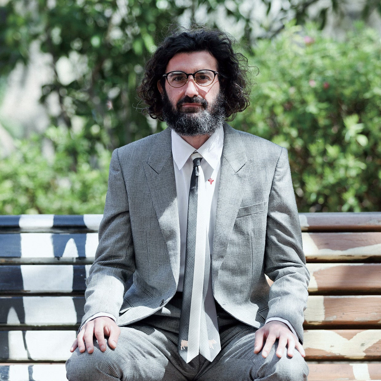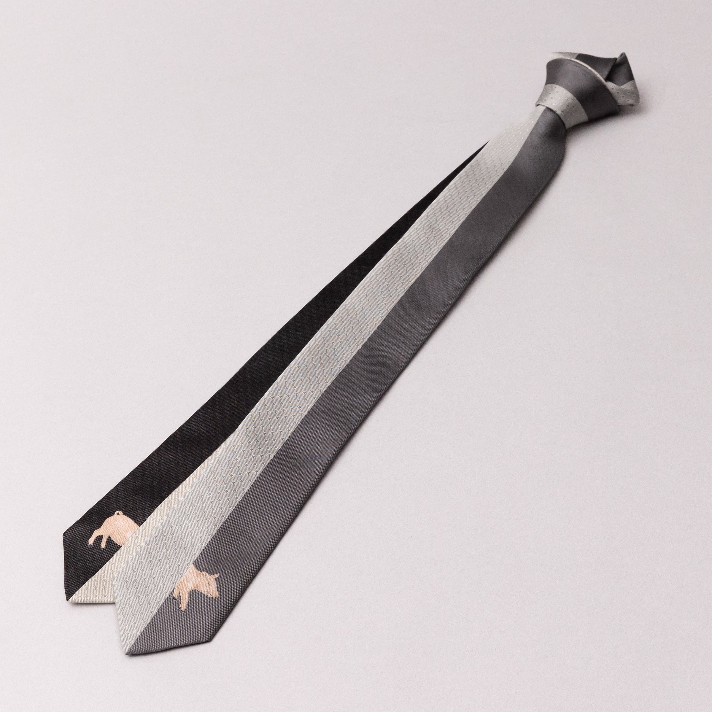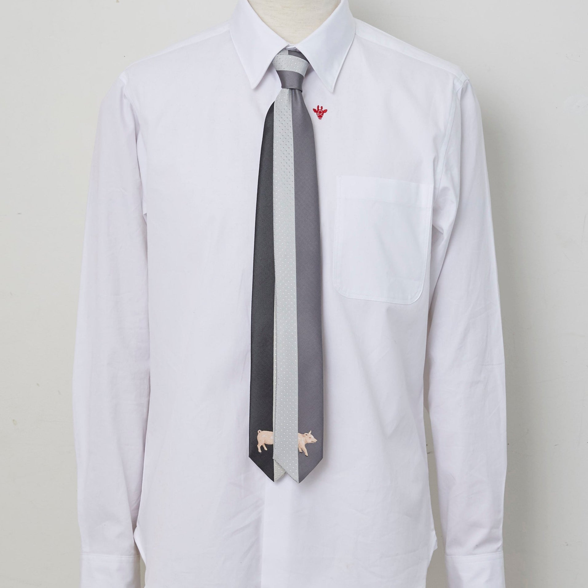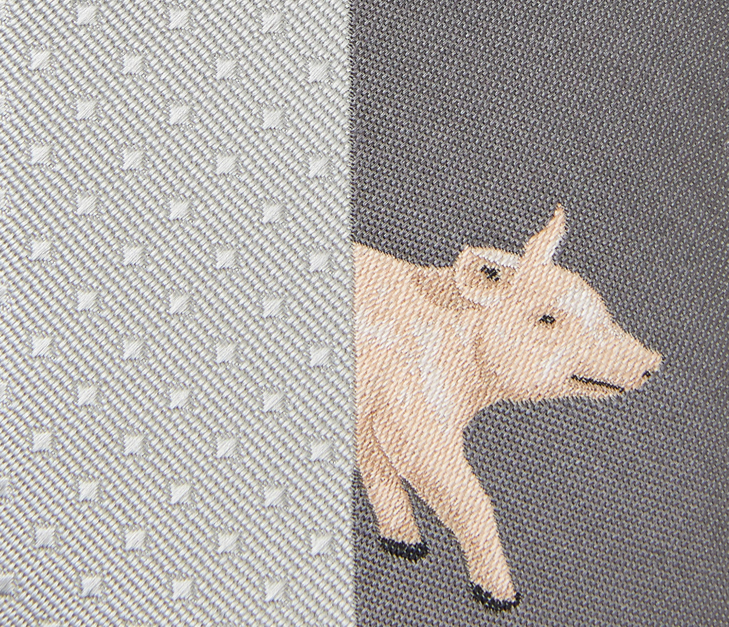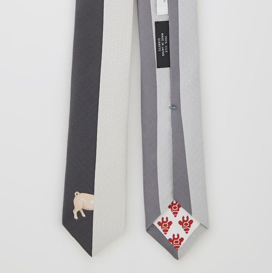 センターで縦に配色されたリバーシブルタイプのネクタイです。剣先には豚が見え隠れしたユニークで遊び心のあるデザインですが、柄はしっかり46度の角度で織り、中心にそろえて縫製をするため、実はとても技術の詰まった一本です。