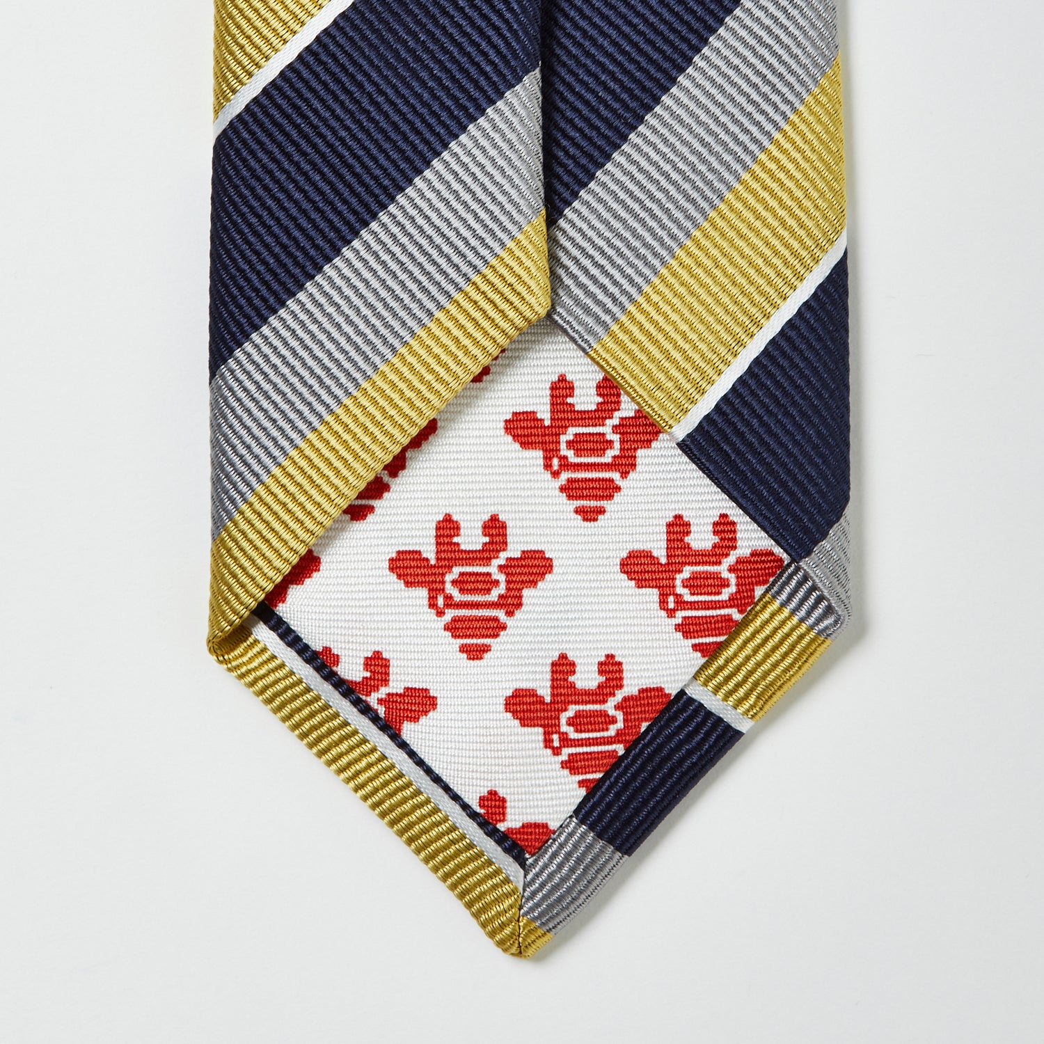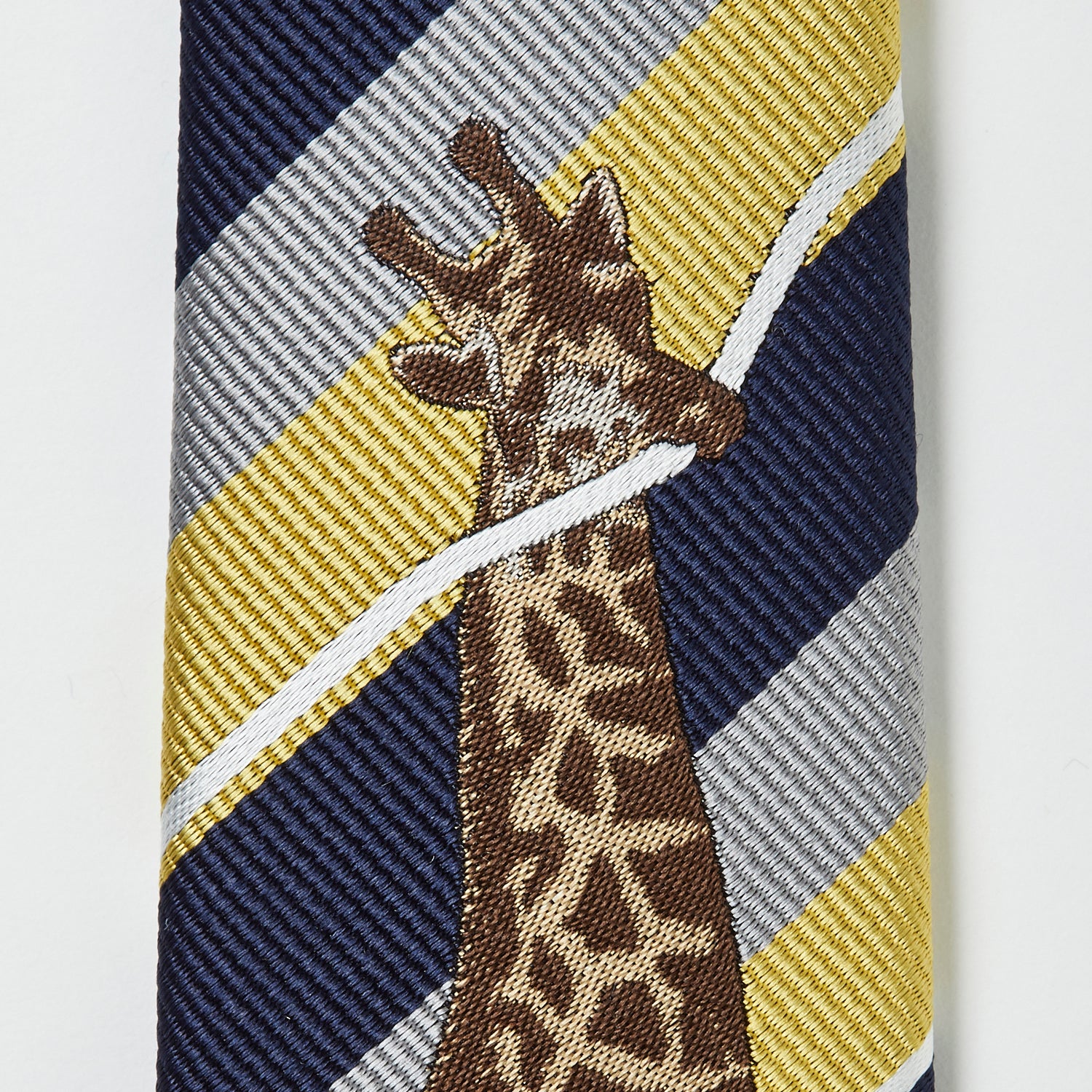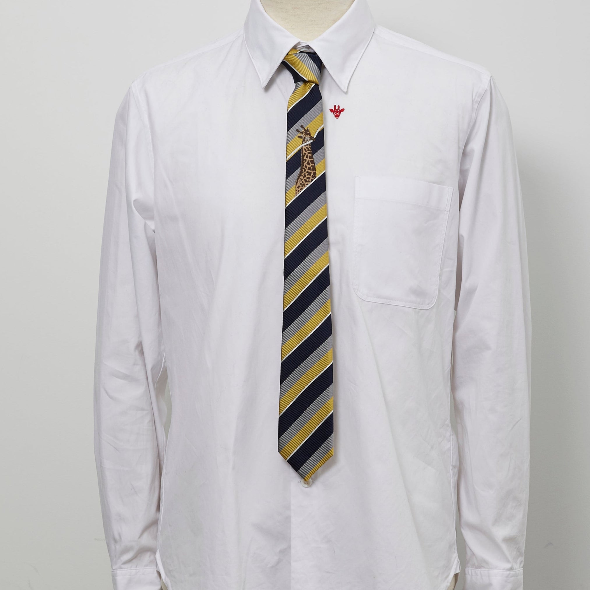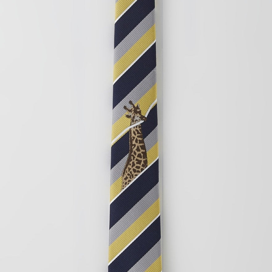 レジメンタルのラインをキリンが銜えているユニークなデザイン。ノット下のあたりにキリンがのぞき、胸元のアクセントになります。ナロータイプのネクタイ幅です。