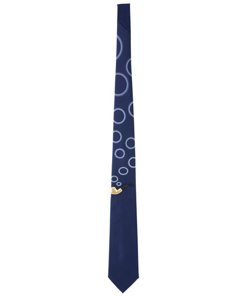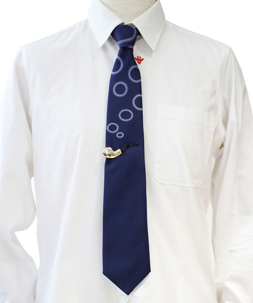 けむりが上にいくほど暈けていく、大きなドット柄になったネクタイと、パイプのネクタイピンがセットになったアイテム。ネクタイピンをすると一枚の絵が胸元に完成します。