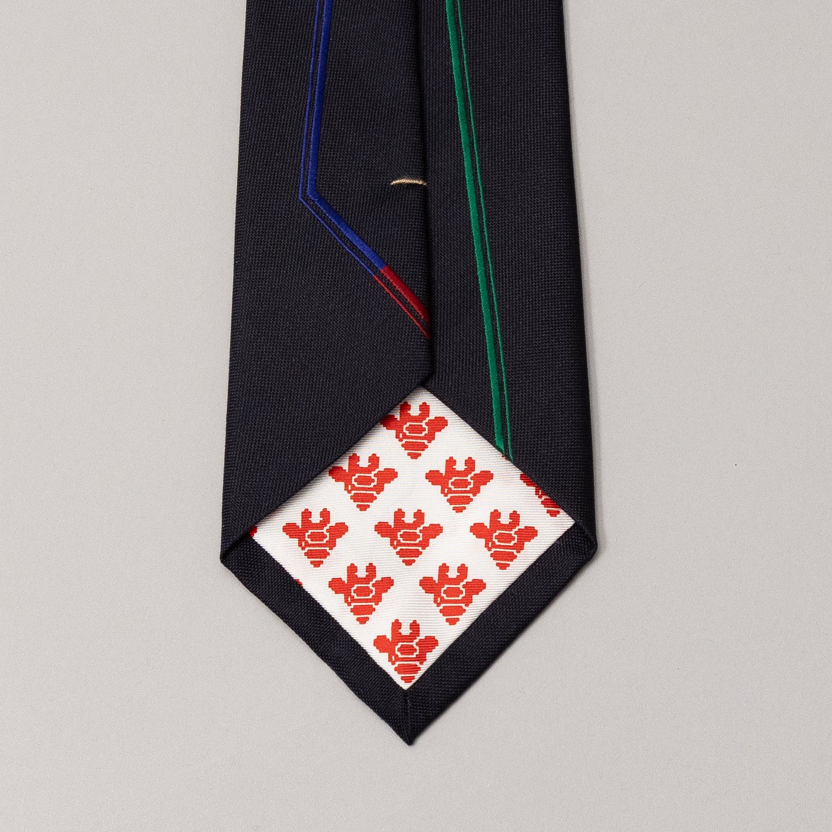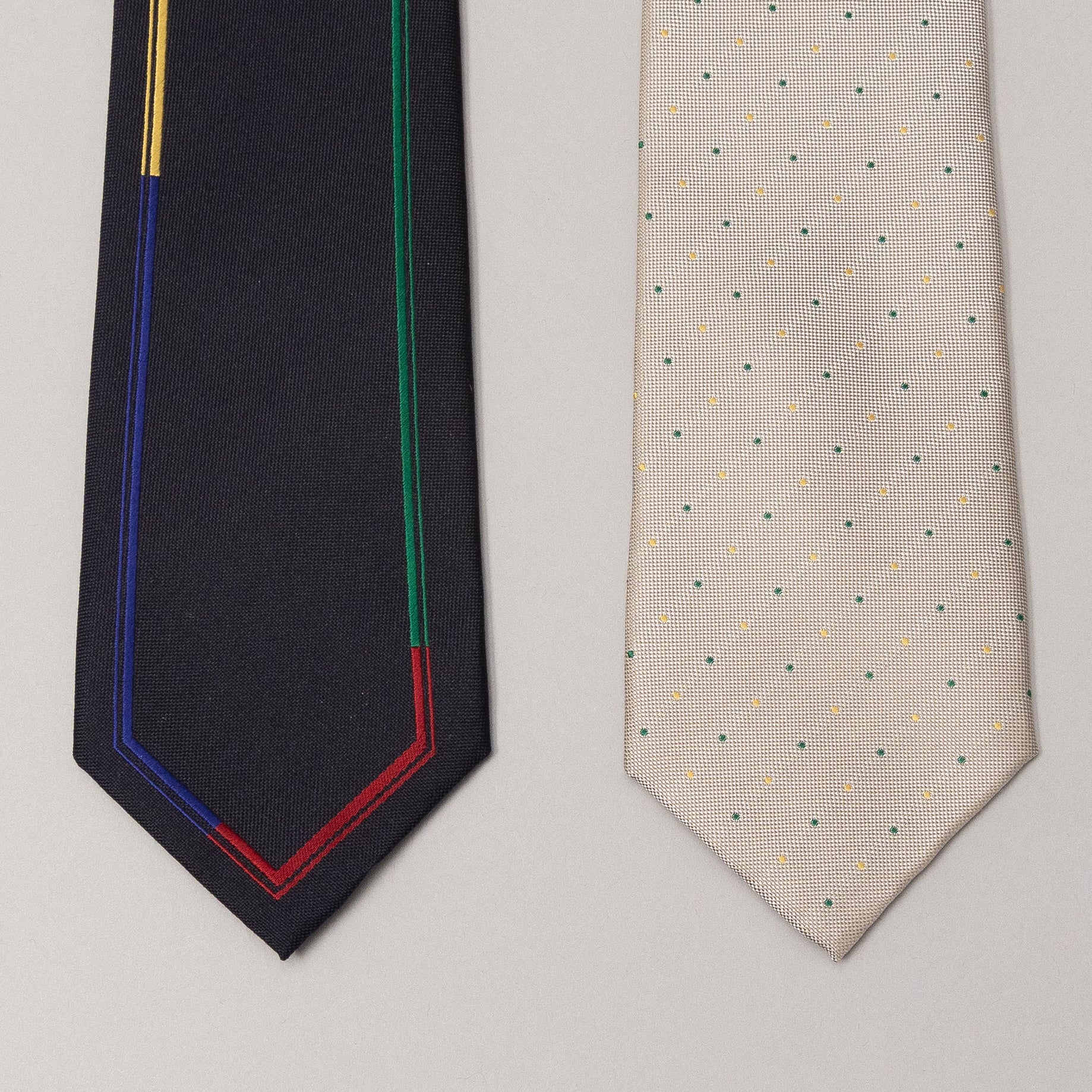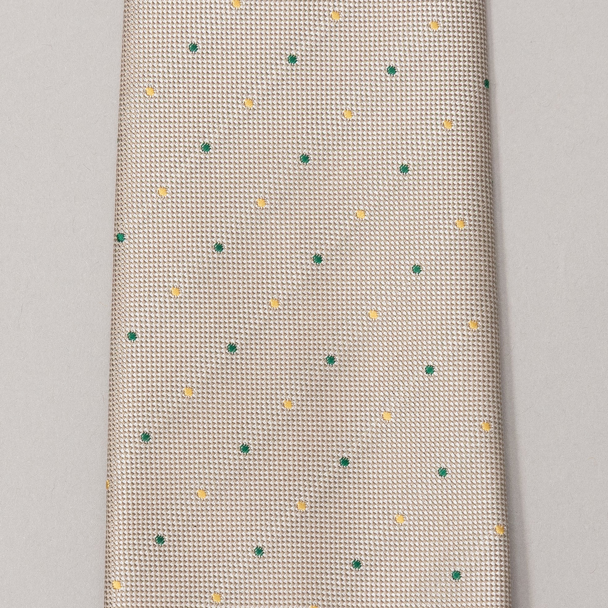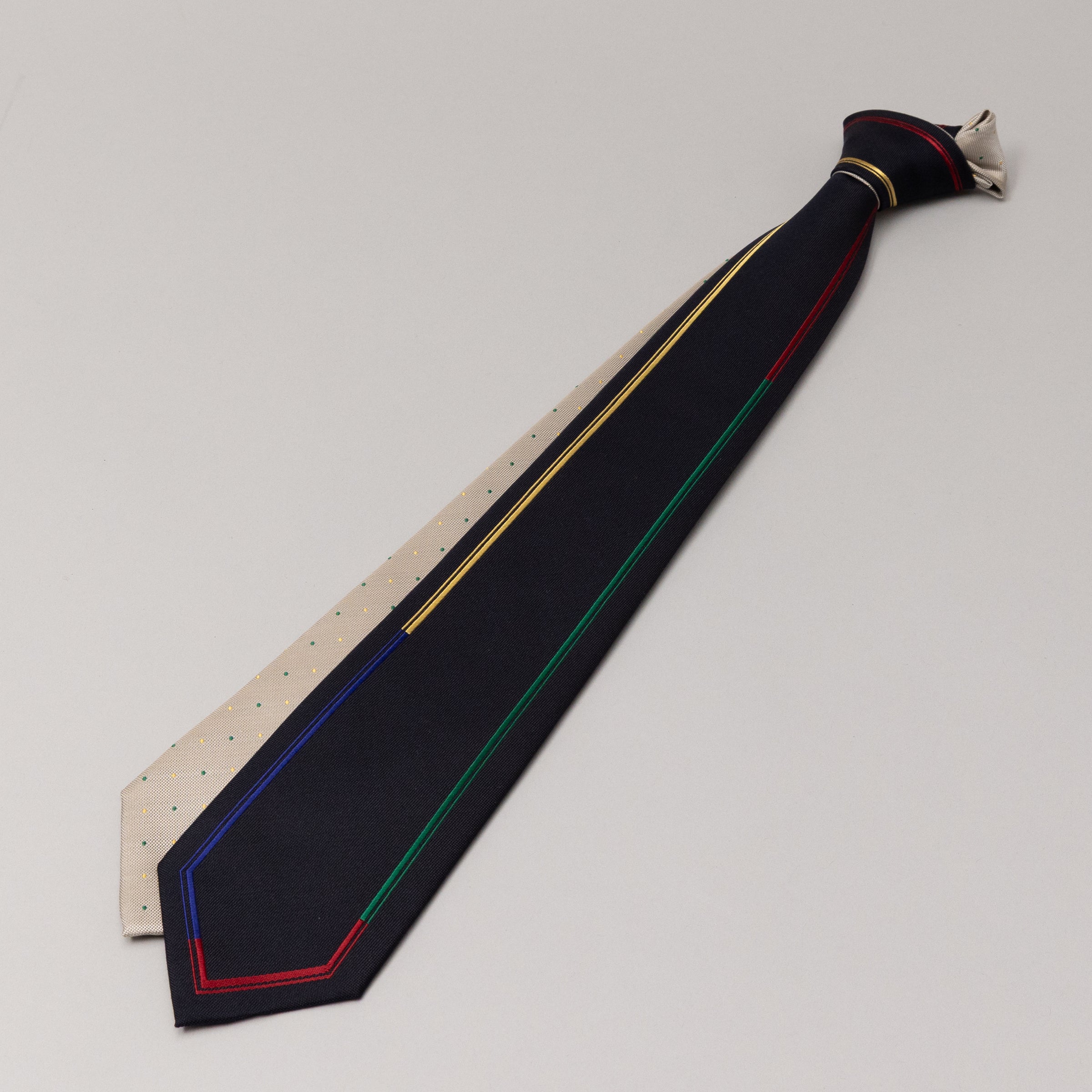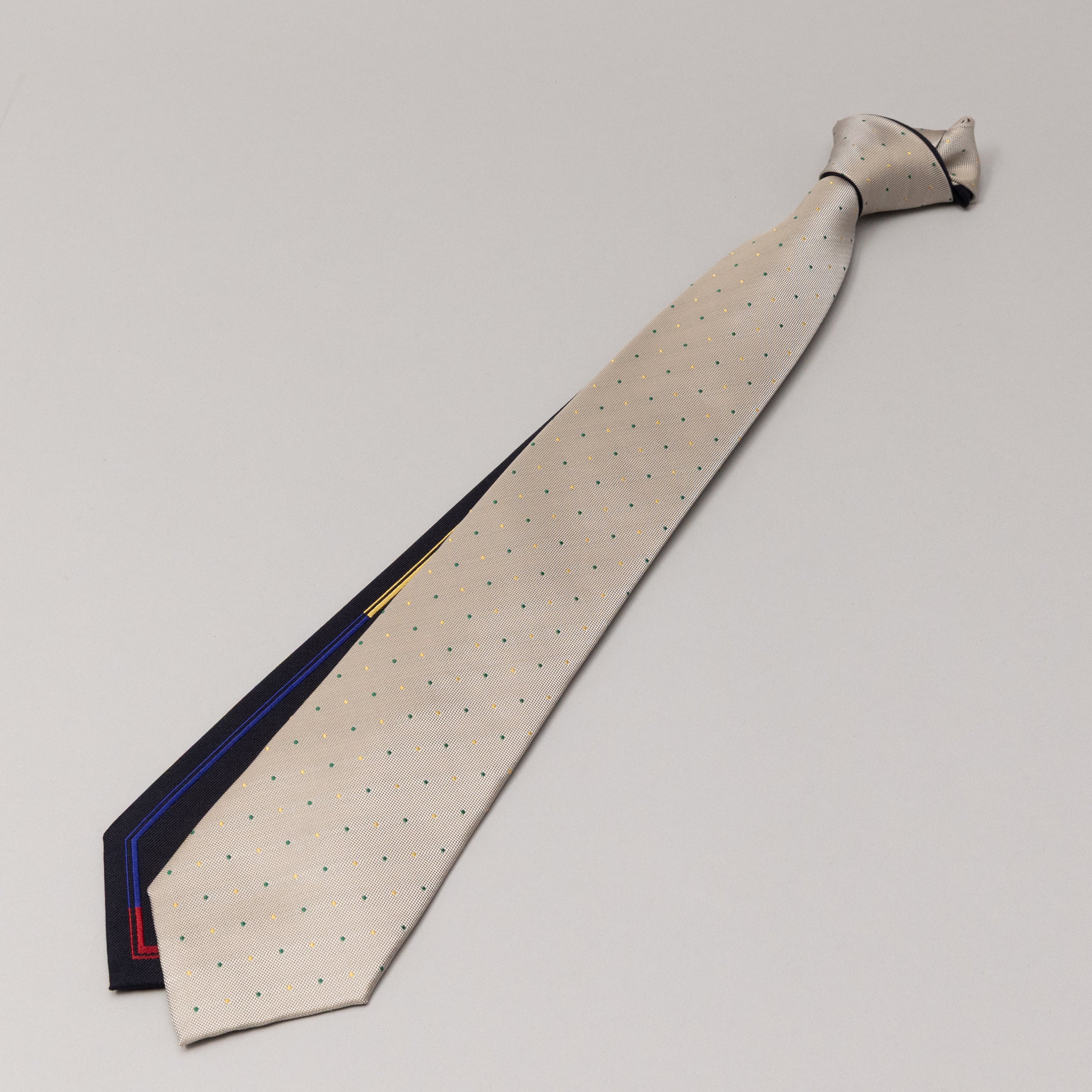 額縁のように織でラインを引いた生地と、柔らかいドット柄の生地を両大剣にしてリバーシブルで楽しめるネクタイです。額縁のラインをバランスよく配するため、織りと縫製の高い技術が詰まったネクタイでもあります。