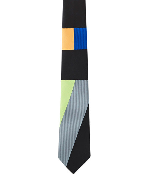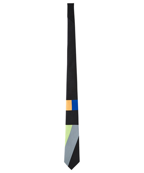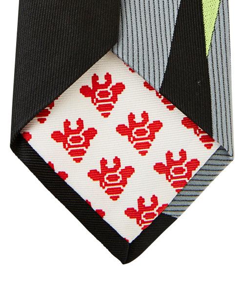 「LOVE」という隠されたメッセージを込めたネクタイ。ネクタイ単体だけ見ると読めませんが、「LOVE」という文字が描かれたアートポスターから、ネクタイのかたちで抜き取ったようなデザインです。アートっぽく、ビビッドな色を効かせるためにポリエステルの蛍光糸を部分的に使用しています。