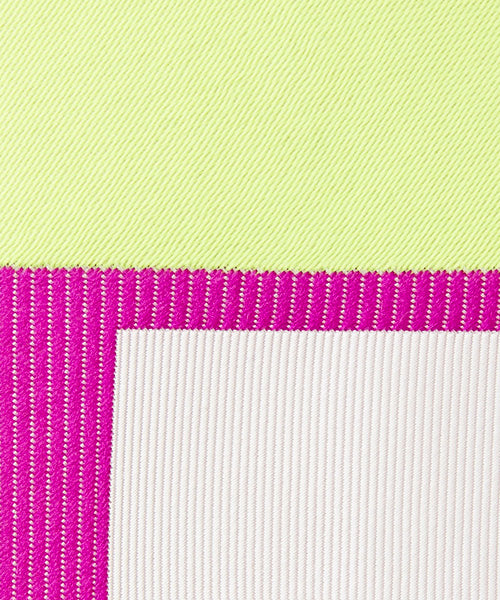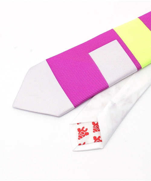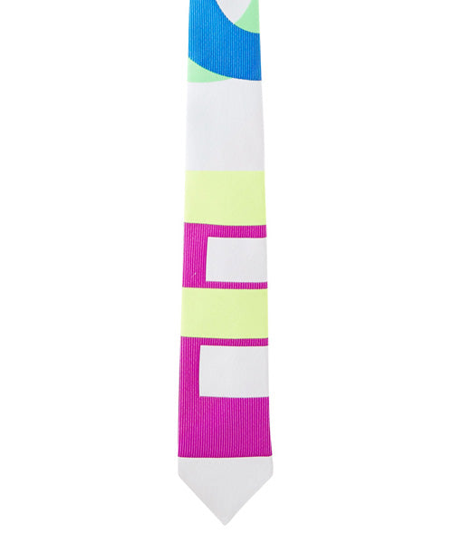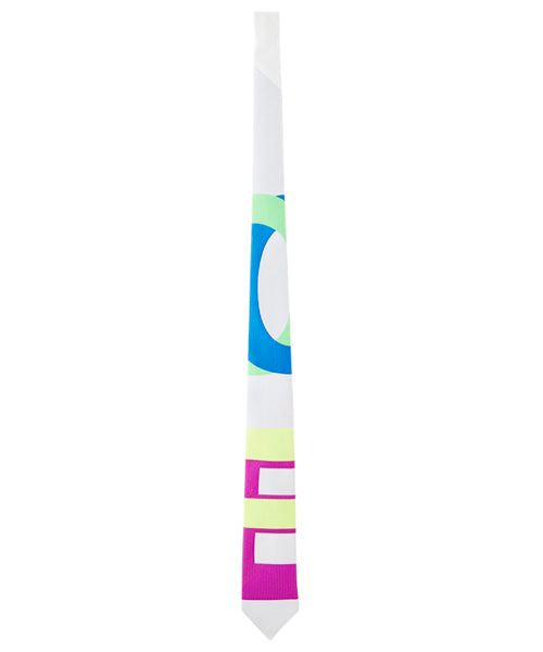 「LOVE」という隠されたメッセージを込めたネクタイ。ネクタイ単体だけ見ると読めませんが、「LOVE」という文字が描かれたアートポスターから、ネクタイのかたちで抜き取ったようなデザインです。アートっぽく、ビビッドな色を効かせるためにポリエステルの蛍光糸を部分的に使用しています。