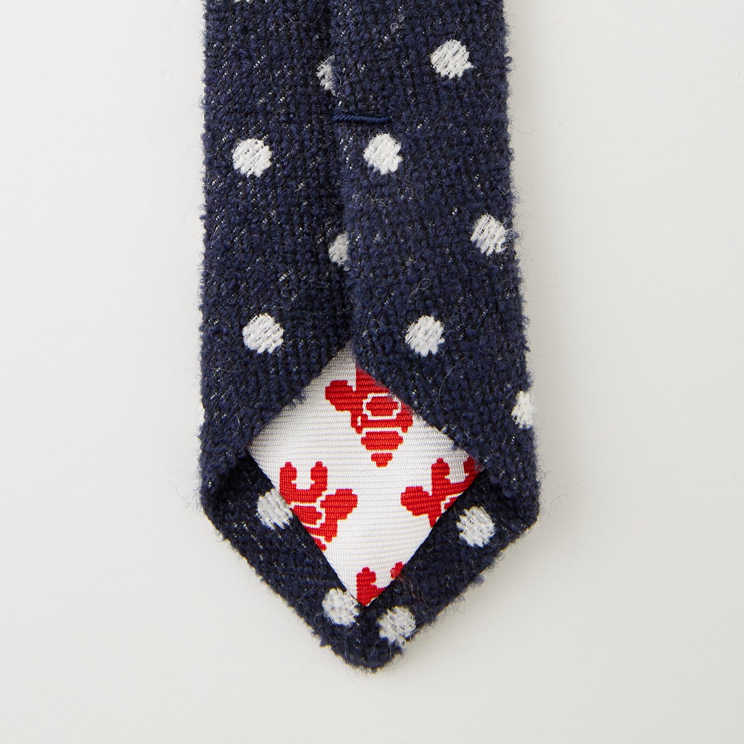 あたたかみのある素材感の冬場にぴったりのネクタイ。表面に輪状の糸が出るように加工されたウールの糸を使っているので、ふんわりとした質感になっています。小剣のドット柄を見せて、コーディネートのアクセントにしていただくのもおすすめです。