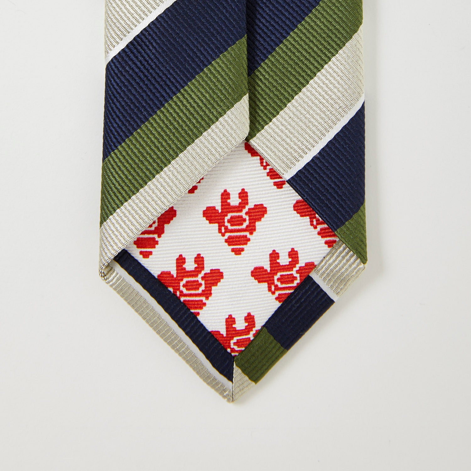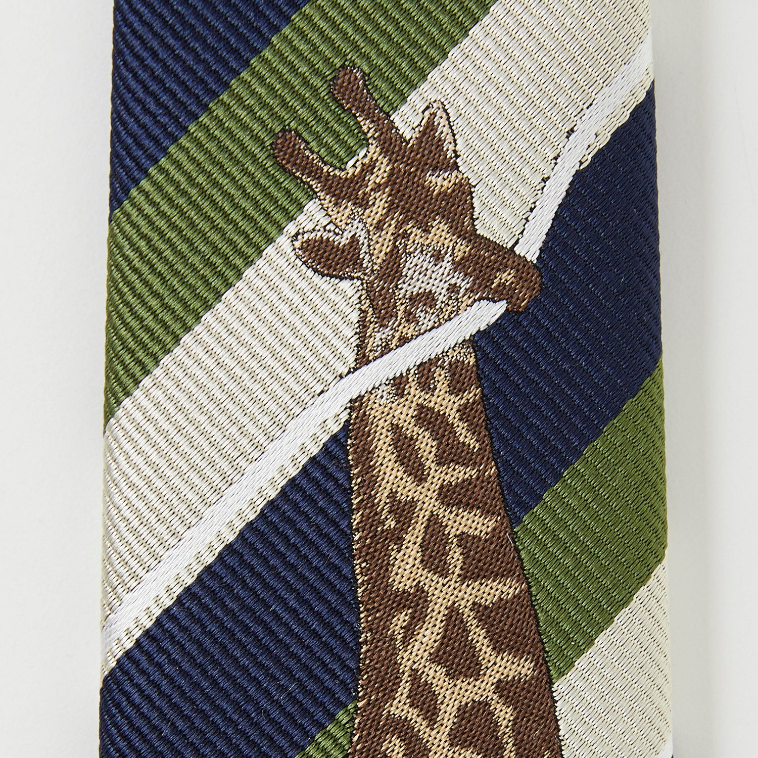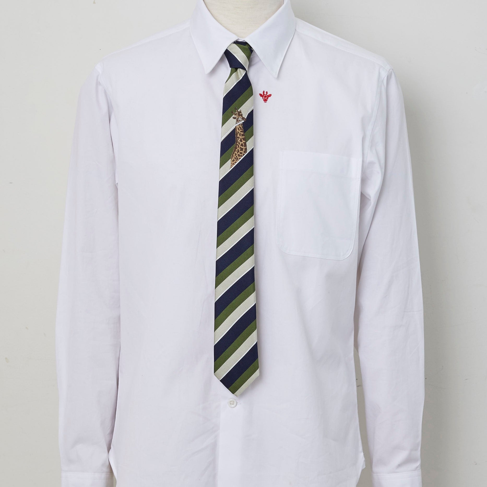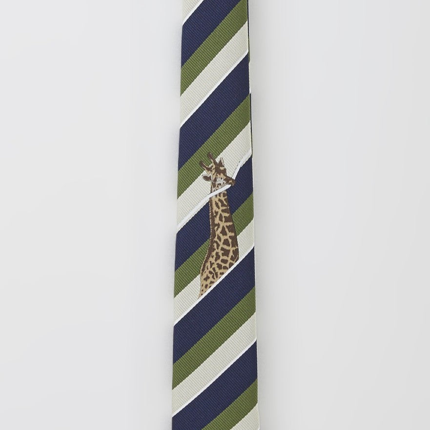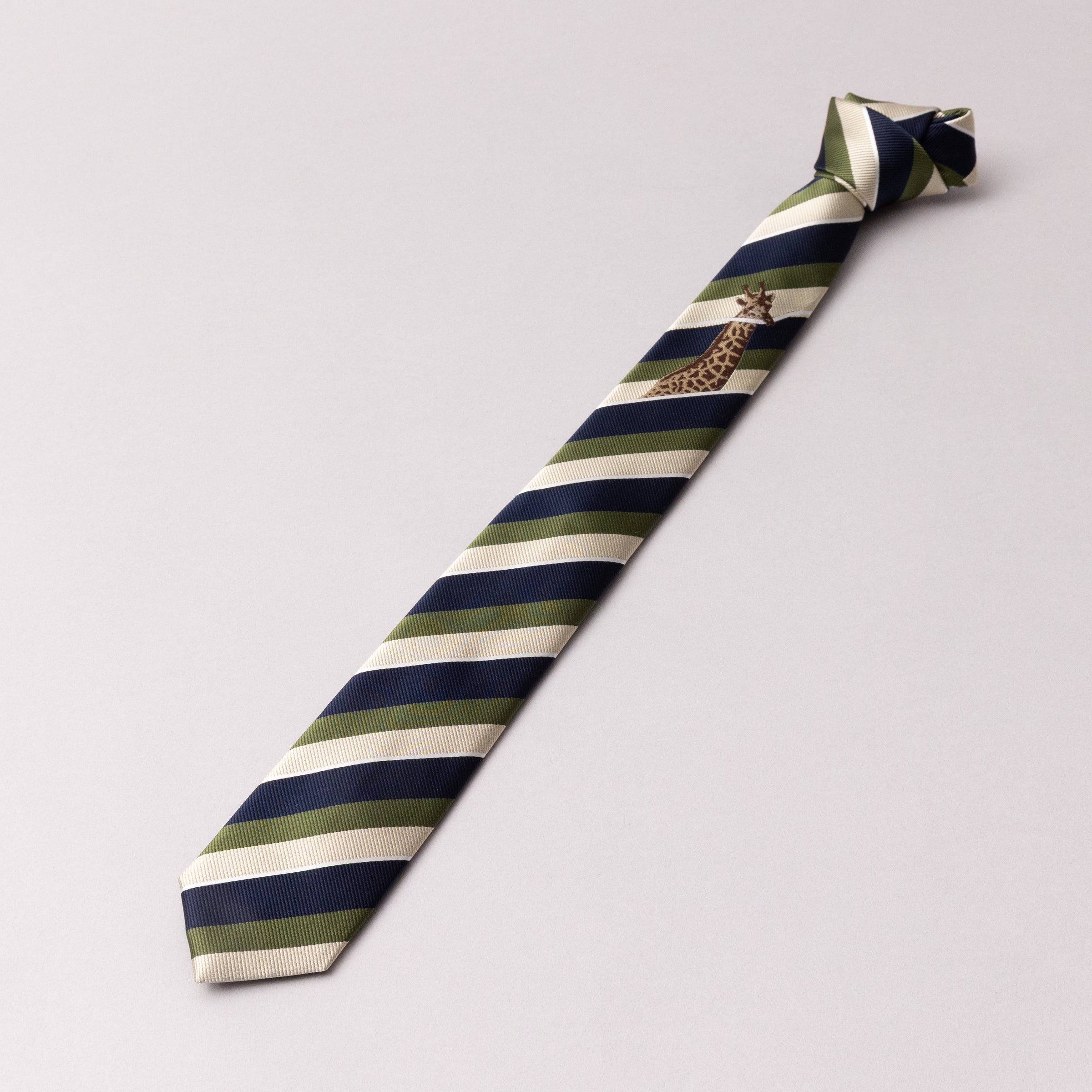レジメンタルのラインをキリンが銜えているユニークなデザイン。ノット下のあたりにキリンがのぞき、胸元のアクセントになります。ナロータイプのネクタイ幅です。