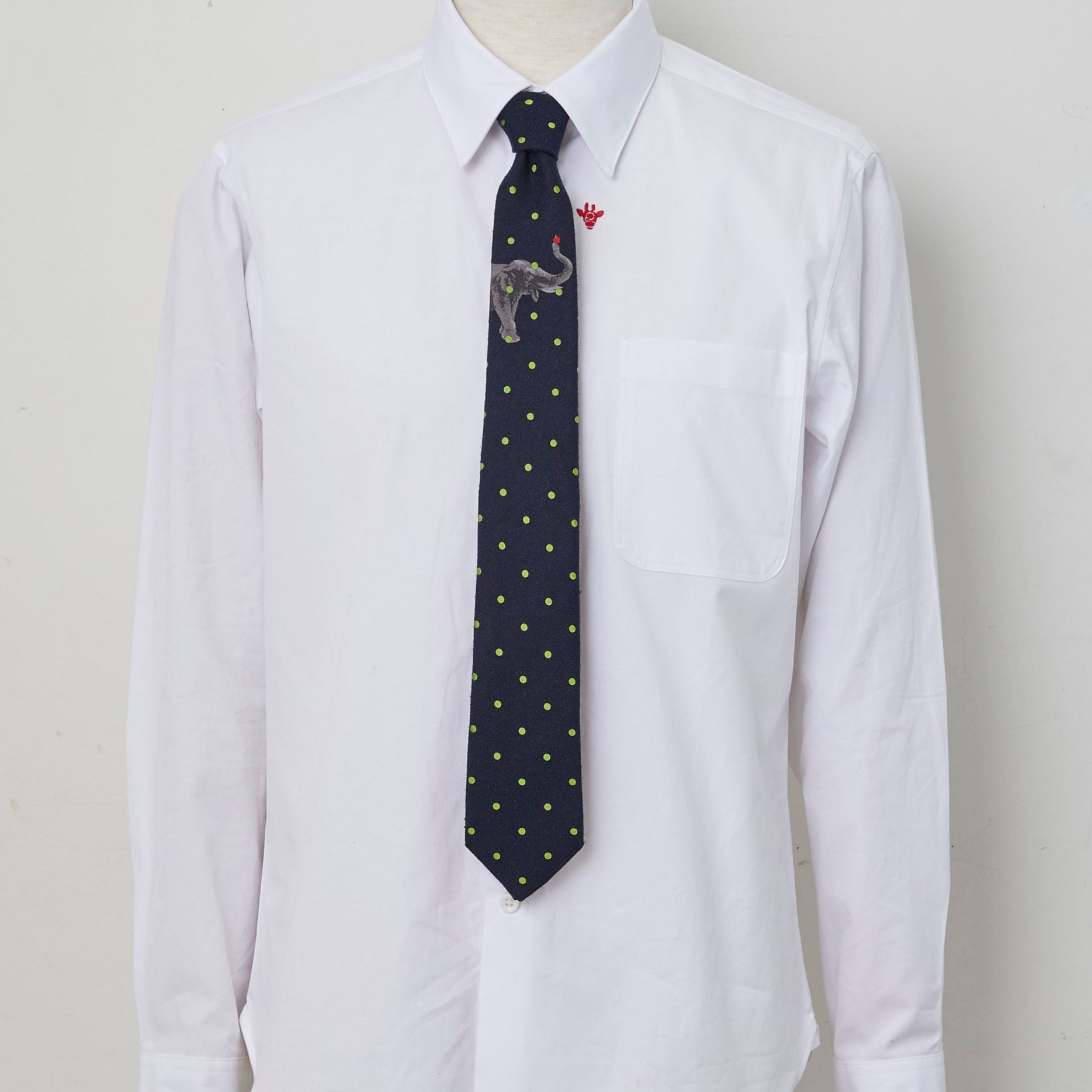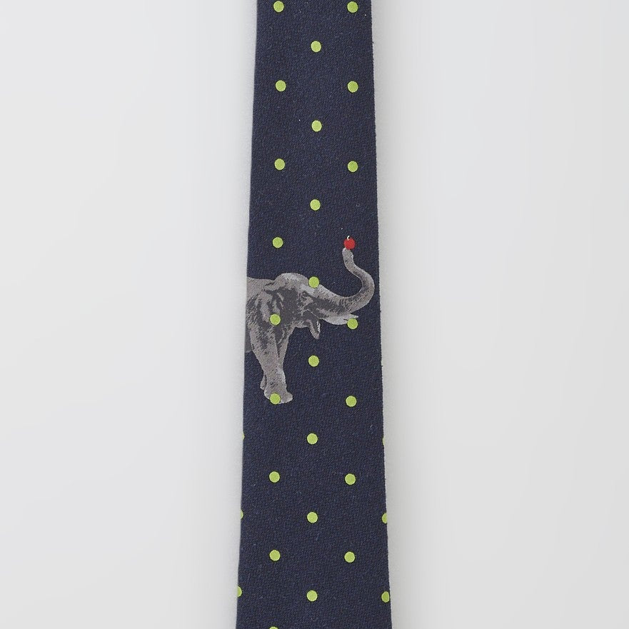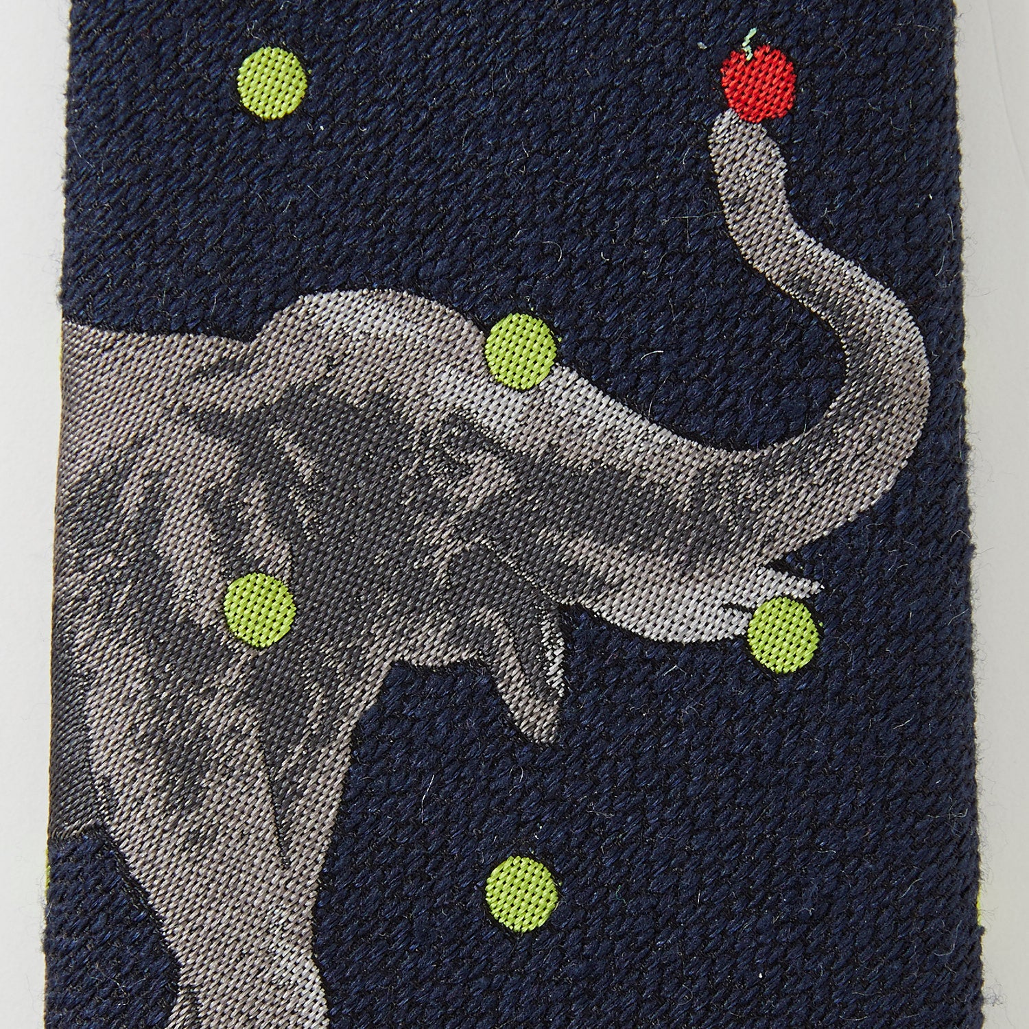 ドット柄の中に、りんごを持ち上げるゾウが戯れているユニークなデザイン。ノット下のあたりにゾウがのぞき、胸元のアクセントになります。全体的にマットな質感で、ベースはマットなシルクネップ糸を、ゾウやドット柄の部分は光沢感のあるシルク糸を使って織りました。