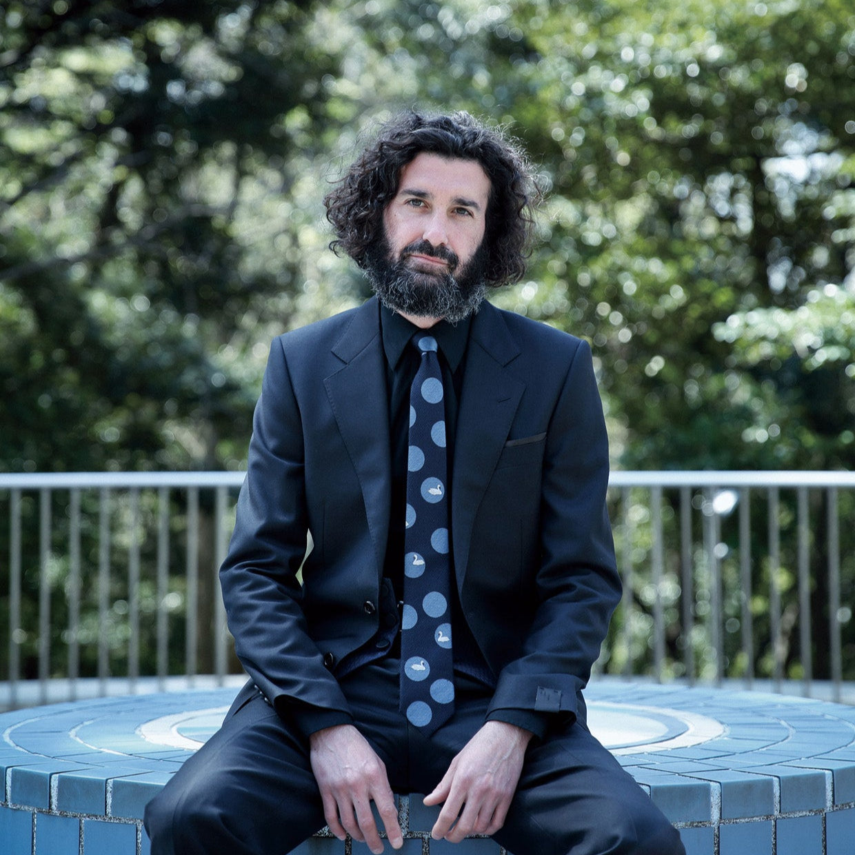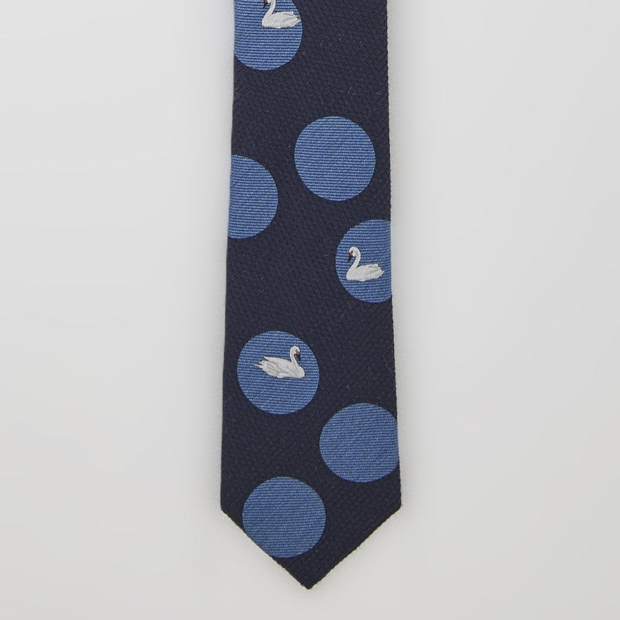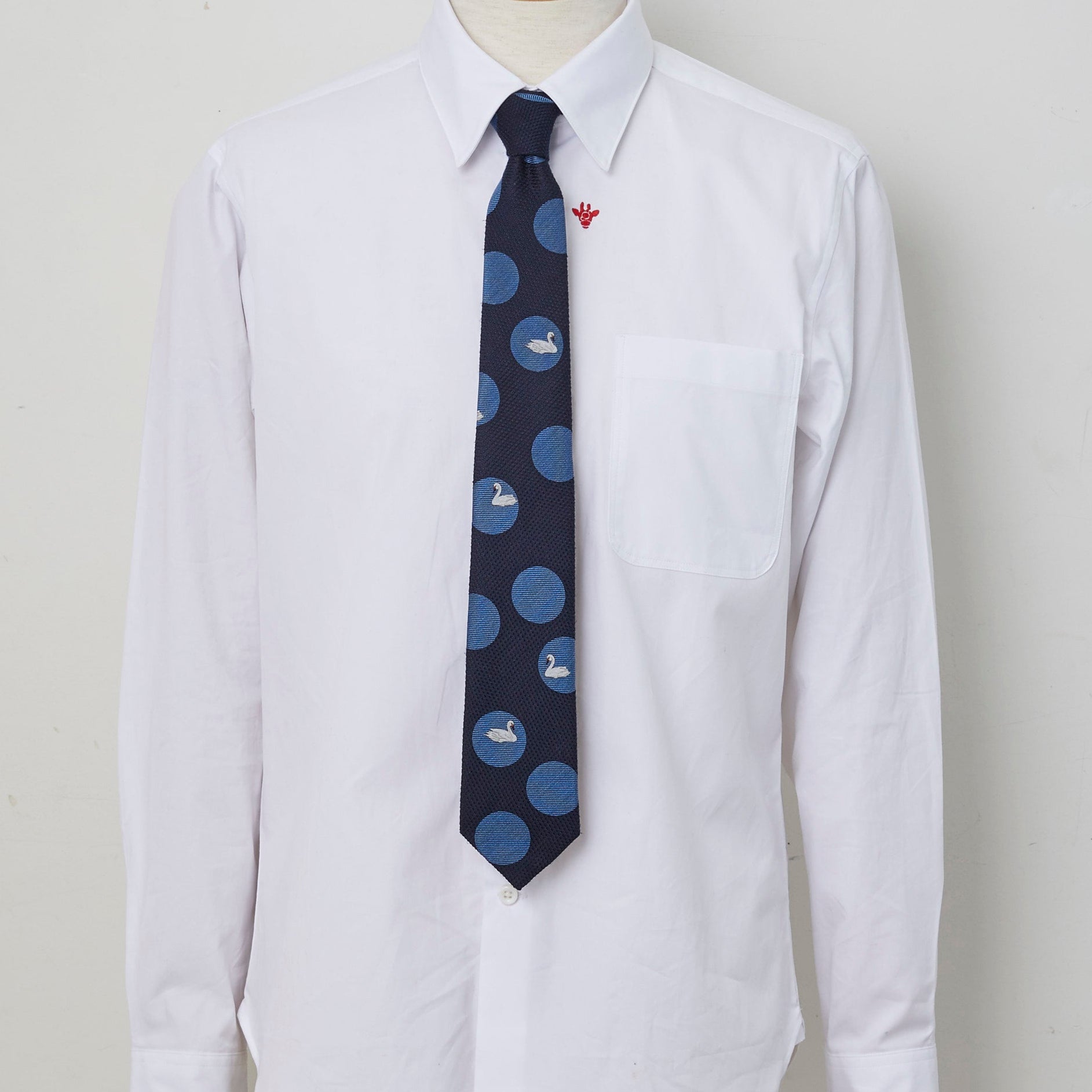 大きなドットの中に、スワンが泳いでいるユニークなネクタイです。全体的にマットな質感で、ベースはシルクネップ糸を、ドット柄の部分はシルクトップ糸を使って織りました。
